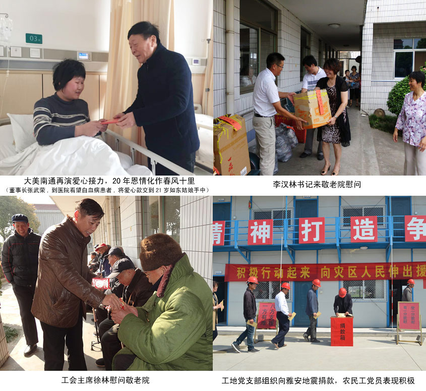 公司成立二十五年以來,從初期連續(xù)十年支助二個孤兒開始,先后資助新疆伊犁多名貧困學生,連續(xù)多年看望慰問幸福敬老院、秦灶敬老院、唐閘敬老院、市北養(yǎng)老中心的老人,對素不相識的癌癥病人、重危病人、交通事故致殘人員、燒傷燙傷等病人給予醫(yī)療費支助,向四川汶川、雅安、青海玉樹、云南魯?shù)榈卣鹫饏^(qū)和鹽城6.23特大龍卷風等災區(qū)積極捐款,樂施港閘市政人的援助之手,為使愛心傳承更久遠,施援更高效,公司已分別在南通市慈善總會、港閘區(qū)慈善總會冠名了各100萬元的愛心基金,為特困人群雪中送炭,讓愛的種子、好人文化在港閘市政薪火相傳。